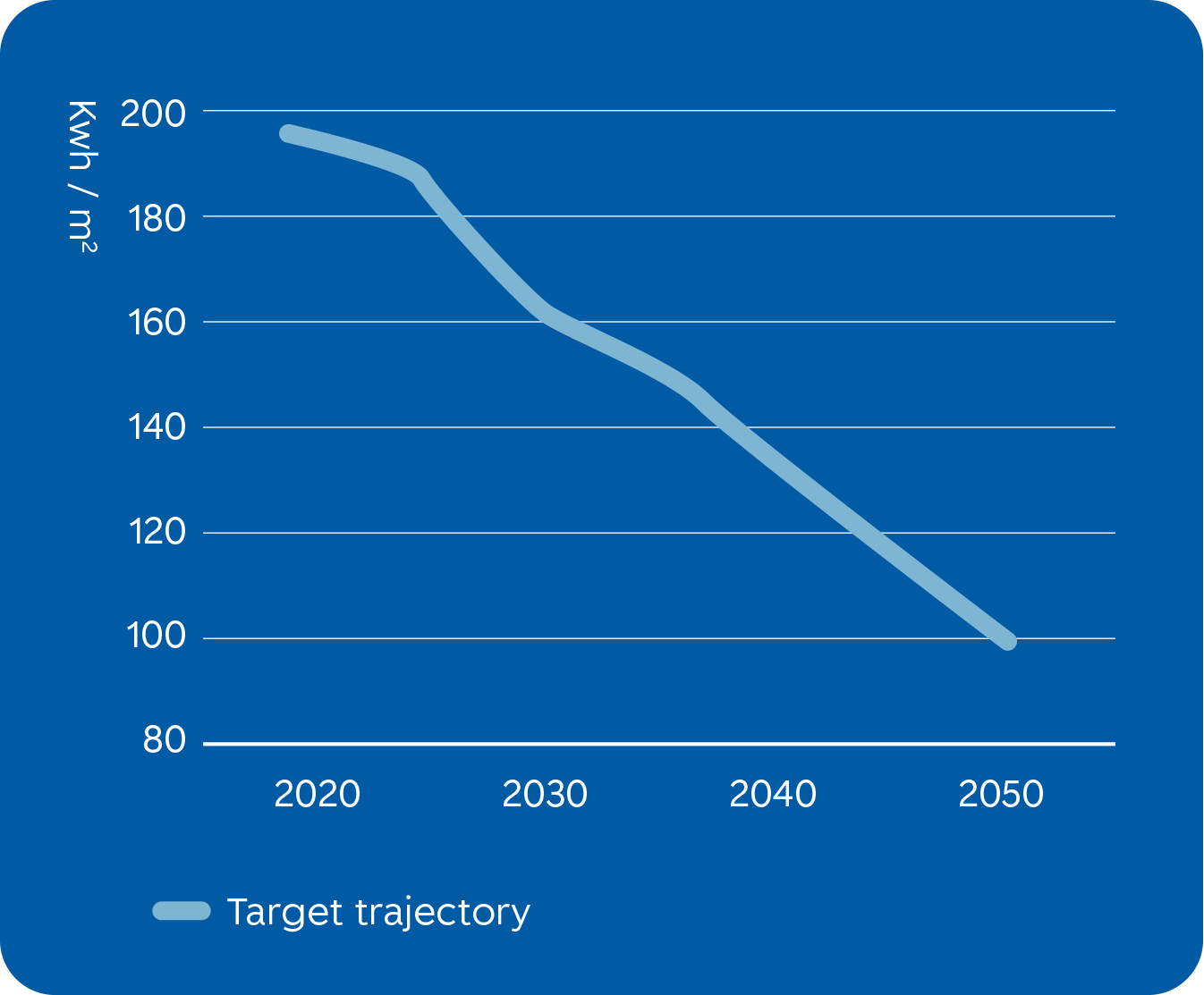 The target pathway is expressed in kWh/m² and is based on the EU’s Energy Performance of Buildings Directive, which sets targets for an average reduction in primary energy demand of 16 percent by 2030 and 20–22 percent by 2035. By 2050, the objective is for the building stock to be aligned with the ambition of a zero‑emission building stock. In addition to reduced energy consumption, emissions from the power system are expected to decline further through the phase‑out of fossil energy sources, which is necessary to achieve the overarching climate targets.