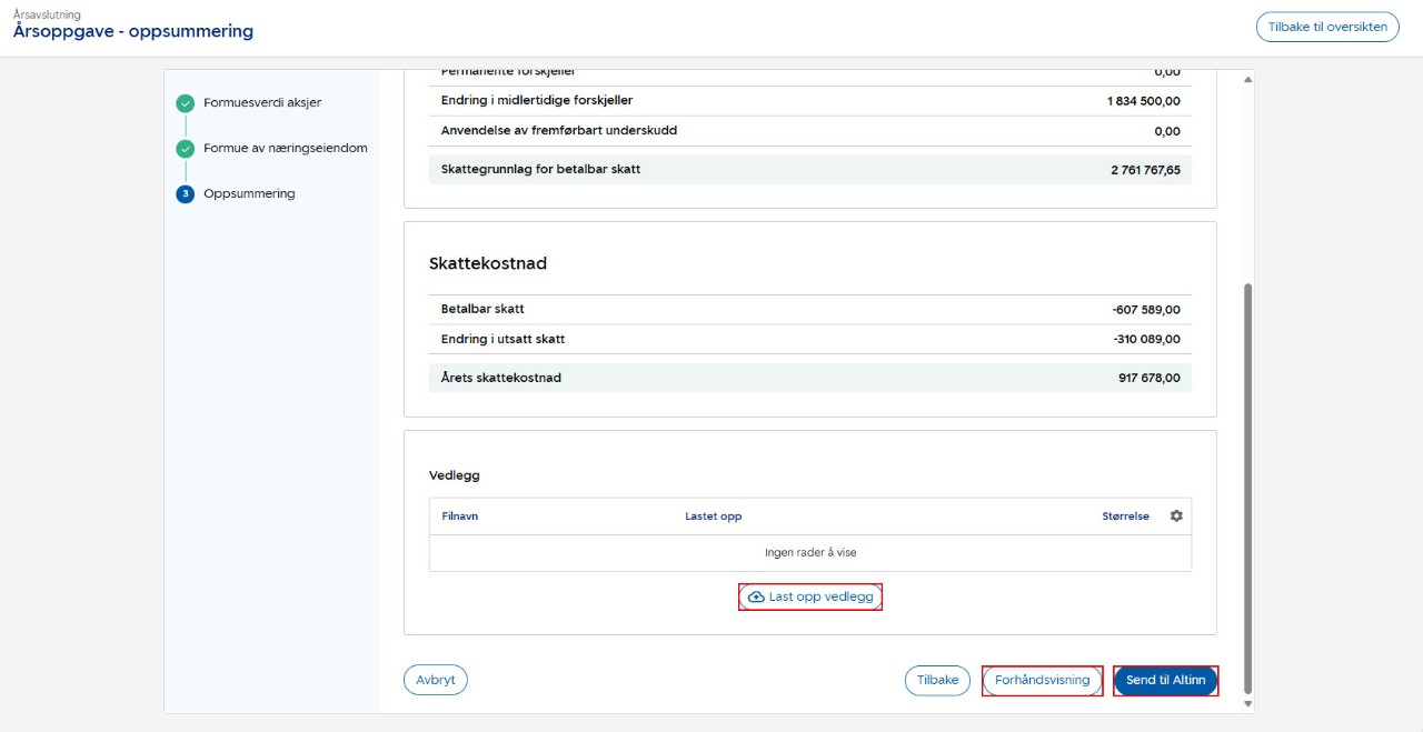 Til slutt ser du en oppsummering av tallene i årsoppgaven (skattegrunnlag for betalbar skatt og årets skattekostnad) som sendes til Altinn. Her har du også anledning til å laste opp vedlegg, og disse vil legge seg sammen med skattemeldingen og næringsspesifikasjonen i Altinn.