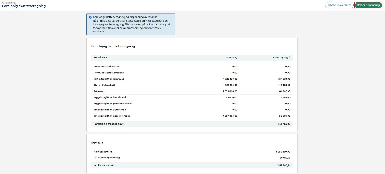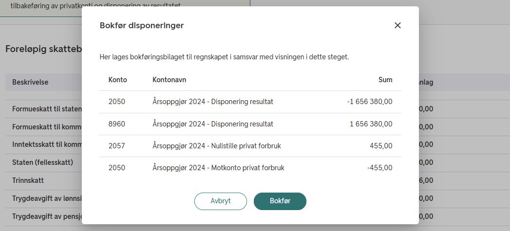 Når du klikker på Bokfør disponering, vil du få opp et forslag med tilbakeføring av privatkontoer og disponering av resultatet. Se over at det ser fint ut, og klikk på Bokfør.