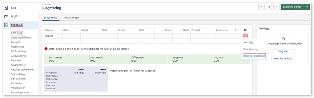 1. Gå til Regnskap i venstremenyen og klikk på Føre bilag