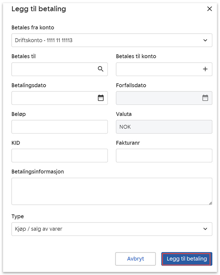 4. Legg inn relevant betalingsinformasjon og klikk på Legg til betaling. Merk at bilaget må bokføres før betalingen blir lagt til i utbetalingslisten.