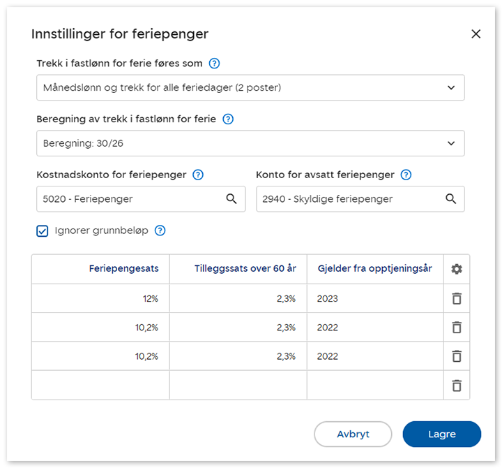 Merk at Ignorer grunnbeløpet vil kun påvirke arbeidstakere over 60 år. Ved å sette hake vil systemet beregne tilleggssats på hele feriepengegrunnlaget, og ikke bare opp til 6G slik lovens minstekrav tilsier. Ved å registrere feriepengegrunnlag kan du manuelt legge inn feriepengegrunnlag per ansatt og eventuelt endre feriepengesats per ansatt.