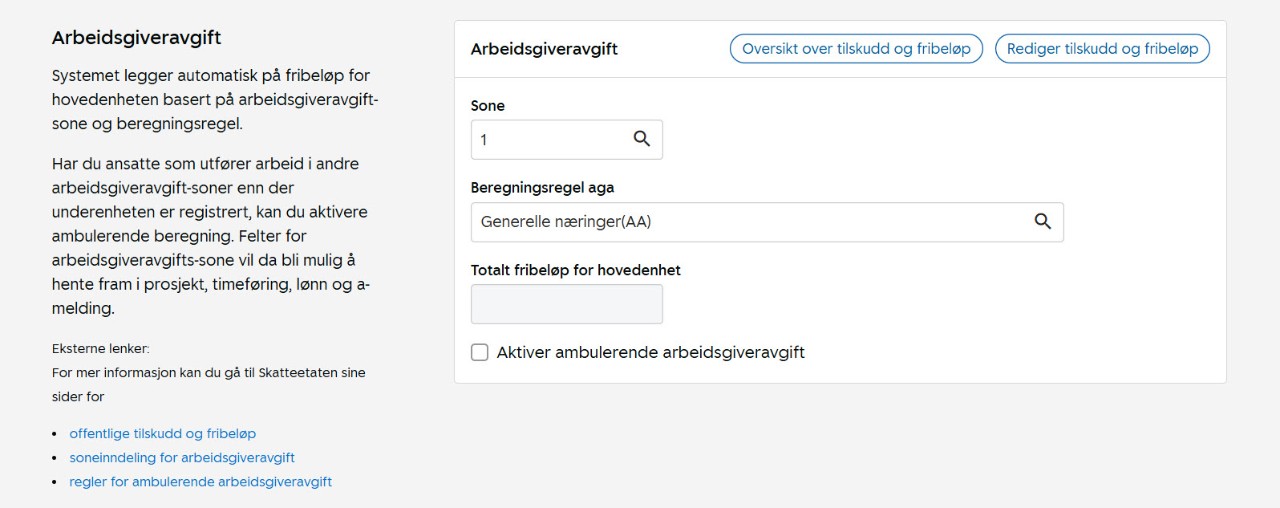 5. Feltet for Totalt fribeløp for hovedenhet blir oppdatert dersom selskapet har denne retten basert på det du fyller inn i feltene for Sone og Beregningsregel aga.