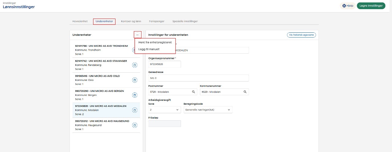 Feltene til høyre for tabellen viser innstillinger på hver enkelt underenhet . Du kan endre disse feltene hvis du har underenheter med ulike soner for arbeidsgiveravgift eller med andre beregningskoder enn hovedenheten.