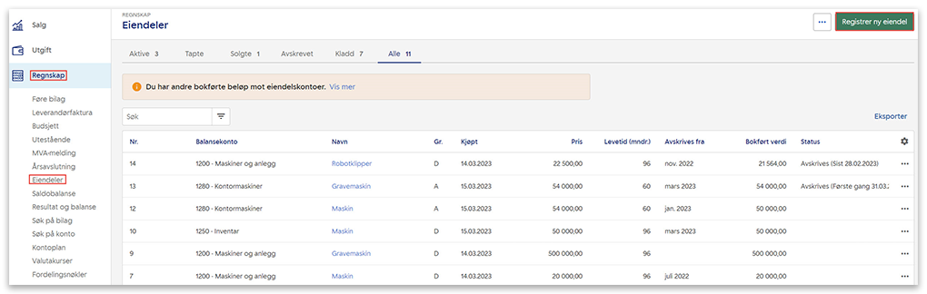 1. Gå til Regnskap i venstremenyen og velg Eiendeler