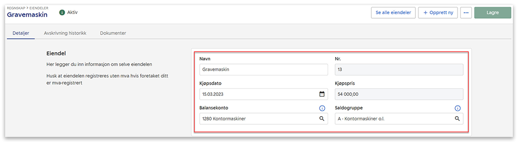 3. Legg inn informasjon om eiendelen. Systemet velger automatisk avskrivningskonto og saldogruppe basert på balansekontoen som er oppgitt.
