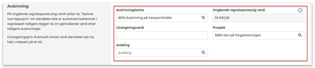 4. Angi kostnadskontoen som avskrivningskostnader skal posteres mot i feltet for avskrivningskonto. Ved registrering av en ny eiendel skal inngående regnskapsmessig verdi være lik kjøpspris. Du kan angi en utrangeringsverdi hvis det er relevant.