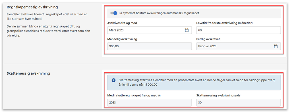 5. Automatisk bokføring av avskrivningskostnader baseres på eiendelens regnskapsmessige verdi og levetid. Du kan overstyre den foreslåtte levetiden basert på balansekontoen. Systemet vil også automatisk beregne skattemessig avskrivning basert på eiendelens verdi og angitt saldogruppe. Klikk på Lagre når all informasjon om eiendelen er lagt inn.