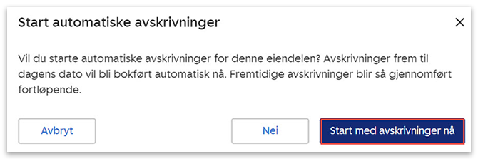 6. På spørsmål om du vil starte automatiske avskrivninger, kan du avbryte og gå tilbake til registreringen ved å trykke Avbryt, vente med å aktivere automatiske avskrivninger ved å velge Nei, eller starte automatiske avskrivninger umiddelbart ved å trykke Start avskrivninger nå.