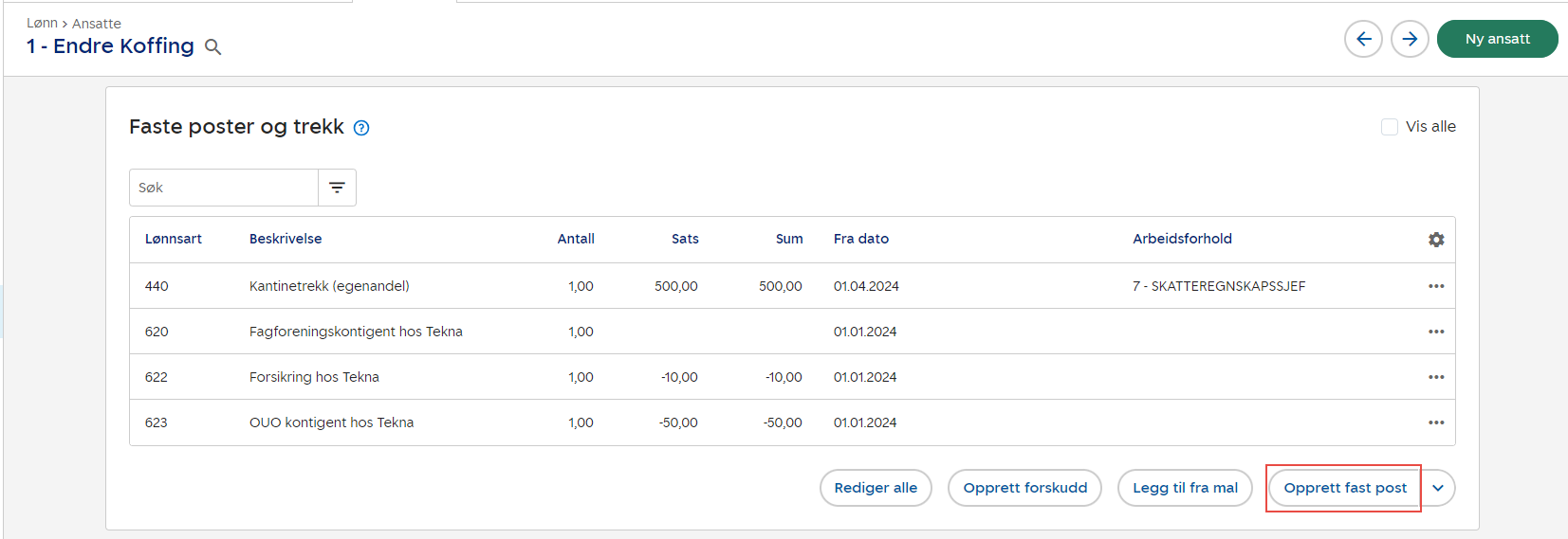 Ved å klikke på Rediger alle, kan du redigere allerede opprettede faste poster. Her kan du også legge til nye faste poster. Merk at en fast post ikke kan slettes, men du kan sette en sluttdato på den.