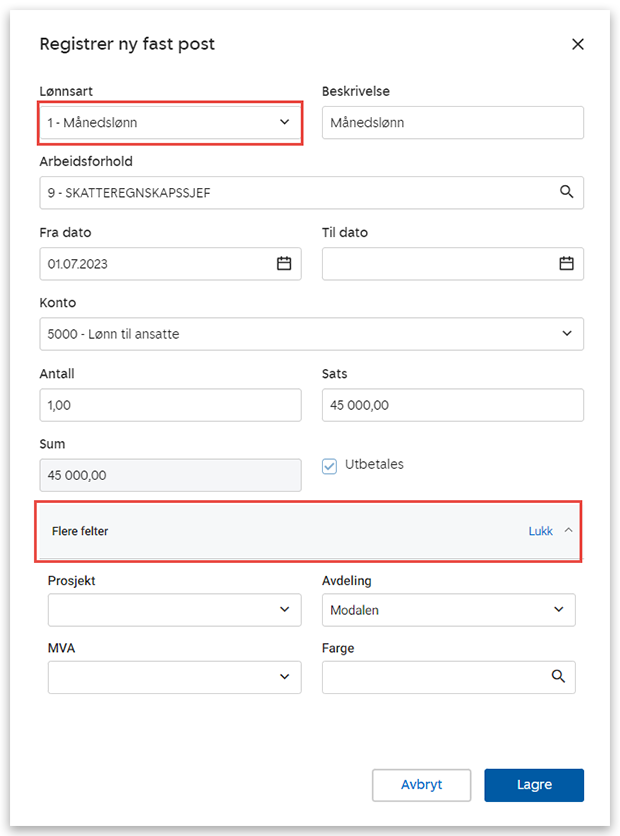 Merk at fastlønn vil avkortes relativt til perioden for lønnskjøringen. Hvis det for eksempel skal utbetales lønn for oktober og en ansatt legges opp med fastlønnspost som starter 15. oktober, vil systemet automatisk legge opp en utbetaling på omtrent 50% av fastlønnen.