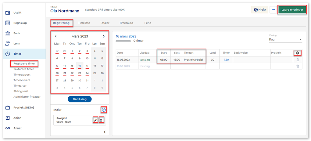 Når du står på valgt dato og klikker på en opprettet mal, vil timene automatisk bli ført basert på malen.