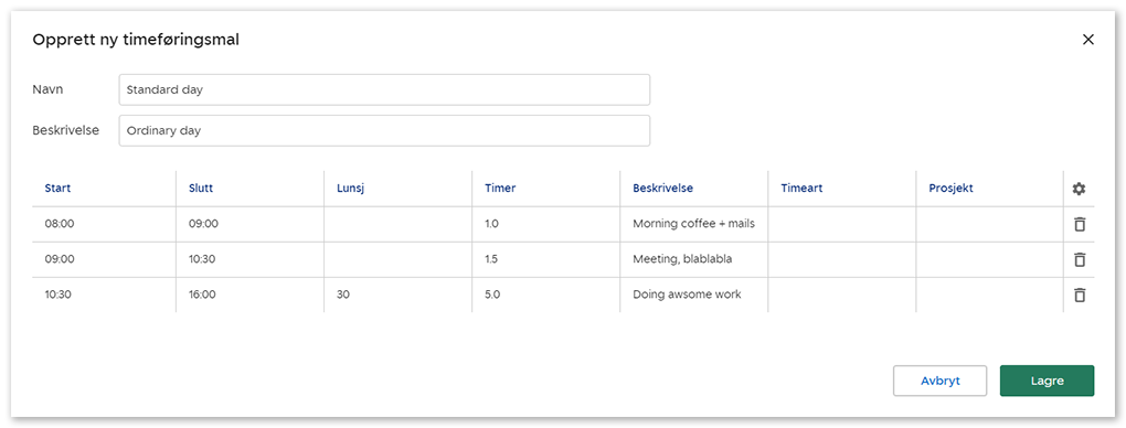 Dersom du har mange like dager, kan du opprette maler for timeregistrering ved å klikke på plusstegnet. Du kan også redigere eller slette eksisterende maler. Ved opprettelse av ny mal må du legge inn Navn og Beskrivelse. Hver mal angir en forhåndsdefinert registrering av timer, og du kan angi følgende info i oppsettet: