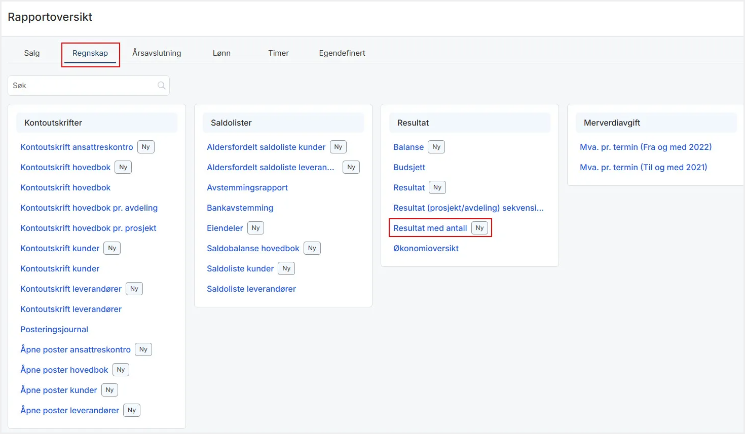 Ved aktivering av utvidelsen Landbruk, får du tilgang til en spesialtilpasset rapport. Gå til Nøkkeltall og Rapporter i venstremenyen, og velg fanen Regnskap i rapportoversikten. Her finner du rapporten Resultat med antall.