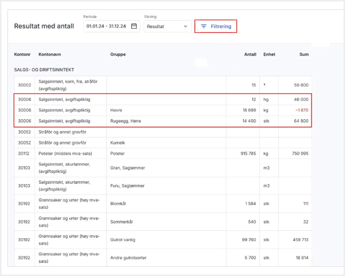 Denne rapporten er veldig lik en vanlig resultatrapport, men her er hver konto som standard gruppert etter landbruksprodukt.