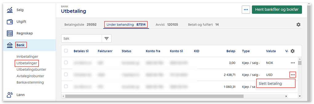 Hvis en betalingspost Under behandling ikke er korrekt, ikke har blitt overført til banken eller lignende, kan du slette den.