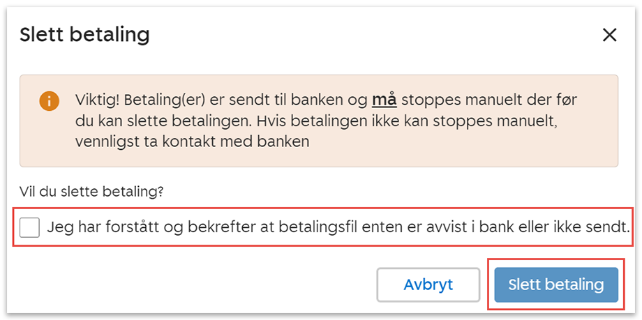 4. Du får nå opp et varsel om at betalingen må stoppes manuelt i banken før du kan slette. Sett hake ved varselet og klikk på Slett betaling.