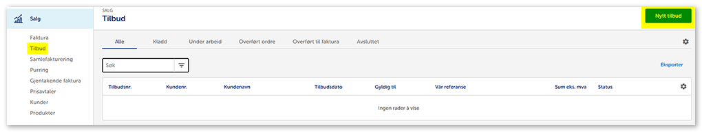 1. Gå til Salg og Tilbud. (Hvis du ikke finner Tilbud i menyen, må du trykke på Rediger menyvalg helt nederst i menyen og huke av for Tilbud). Her får du oversikten over alle tilbud og status på disse.