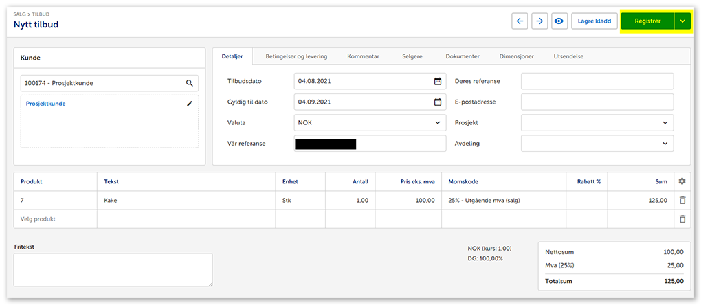 Utover dette vil samtlige data følge med hele veien fra tilbud til faktura. Når du har lagt inn all informasjon, trykker du Registrer