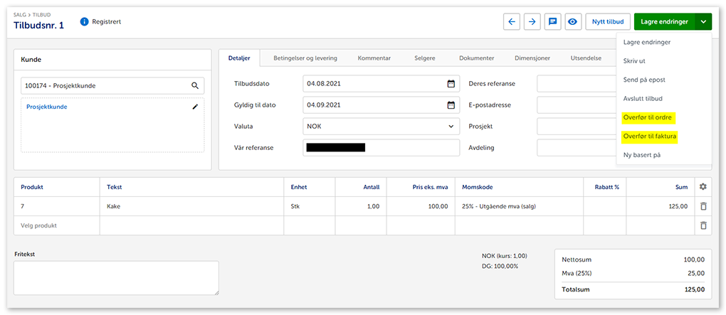 Når du overfører et tilbud til faktura, blir all informasjon tatt med og du blir sendt rett til fakturakladd med korrekt informasjon fra tilbudet.