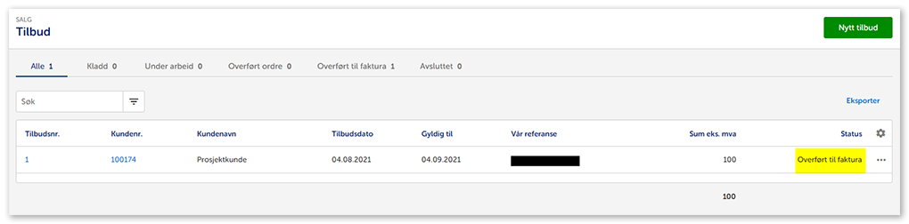 6. Når tilbudet er overført, oppdateres statusen på tilbudet.