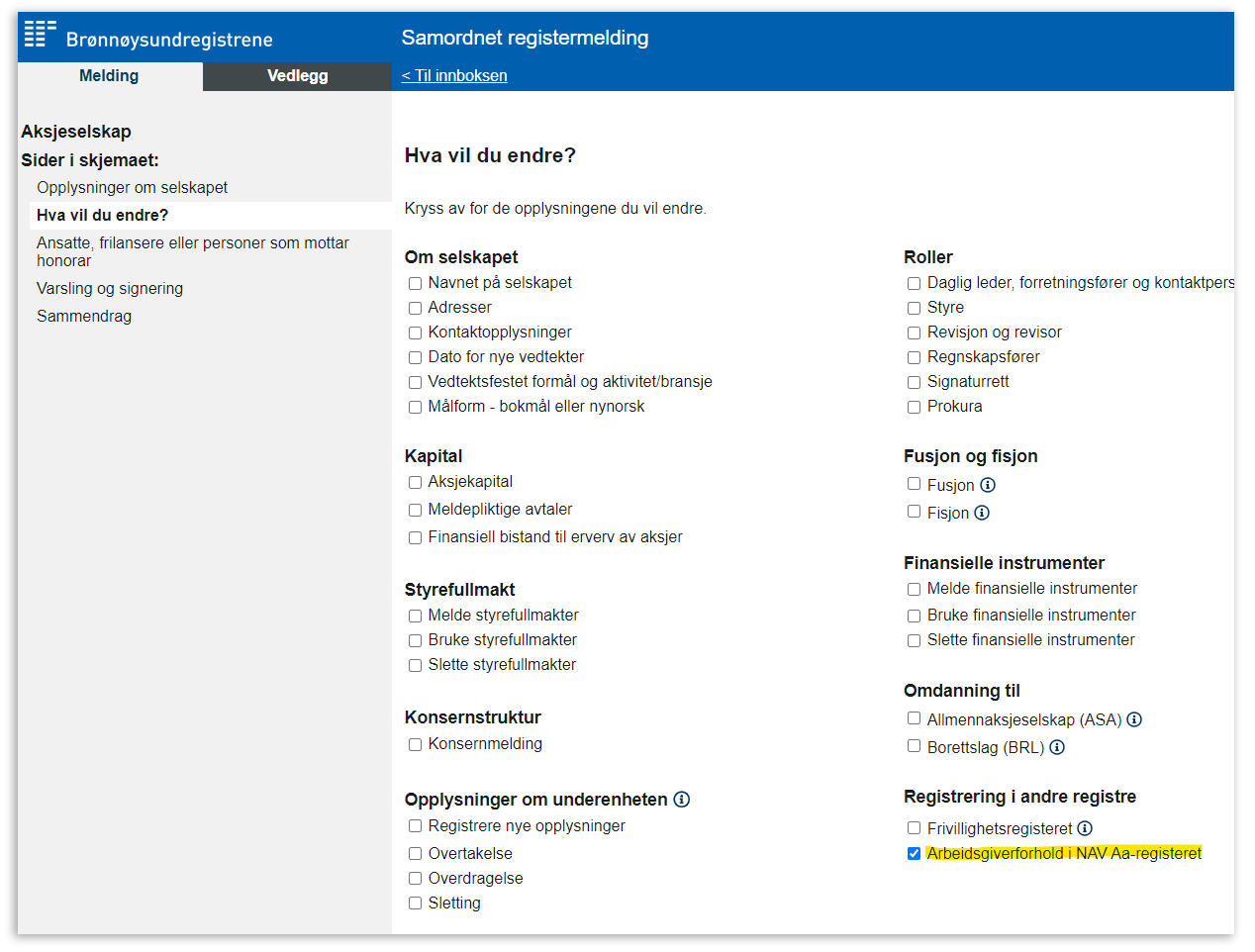 Hvis du ikke registrerte at selskapet skulle betale ut lønn da det ble opprettet, har du ikke fått et virksomhetsnummer. For å opprette virksomhetsnummer til selskapet må du sende inn en Samordnet registermelding og registrere selskapet i NAV Aa-registeret.