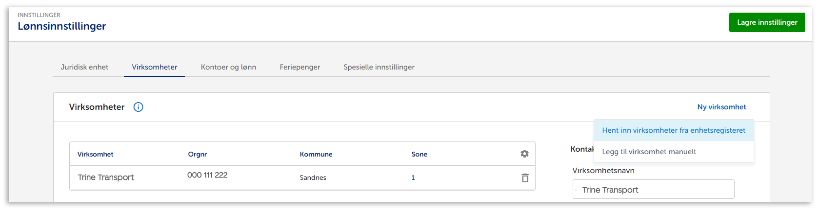 Virksomhetsnummer legger du til i Sparebank 1 Regnskap under Innstillinger - Lønn, og deretter fanen Virksomheter.