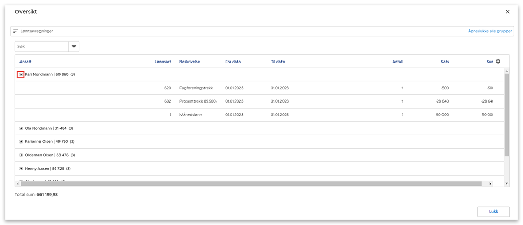 4. Klikk på plusstegnet for å se detaljerte lønnsposter per ansatt.