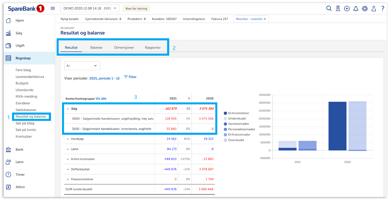 1. Gå til Regnskap i venstremenyen og velg Resultat og balanse.
