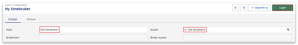 Hvis du skal legge inn en person som timebruker og timene skal overføres til lønn, må personen være opprettet som ansatt i lønnsmodulen. Se hvordan du oppretter ny ansatt.