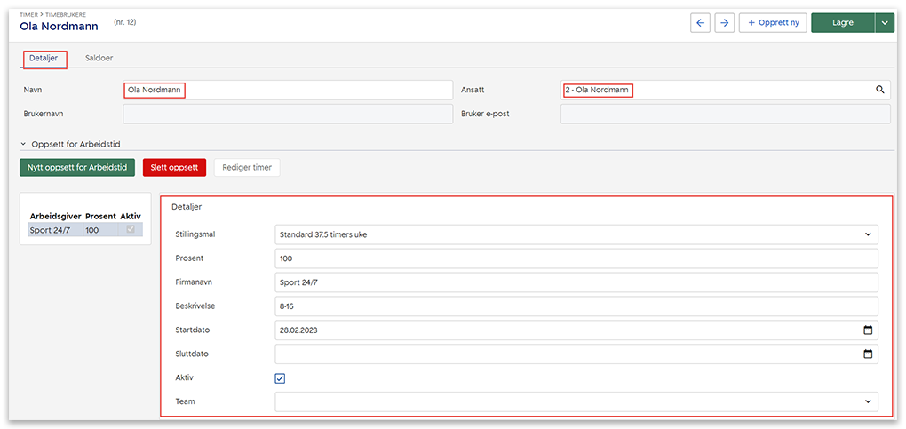 • Team: Her kan du knytte personen mot et team. Dette er kun aktuelt dersom det skal benyttes team for timegodkjenning.
