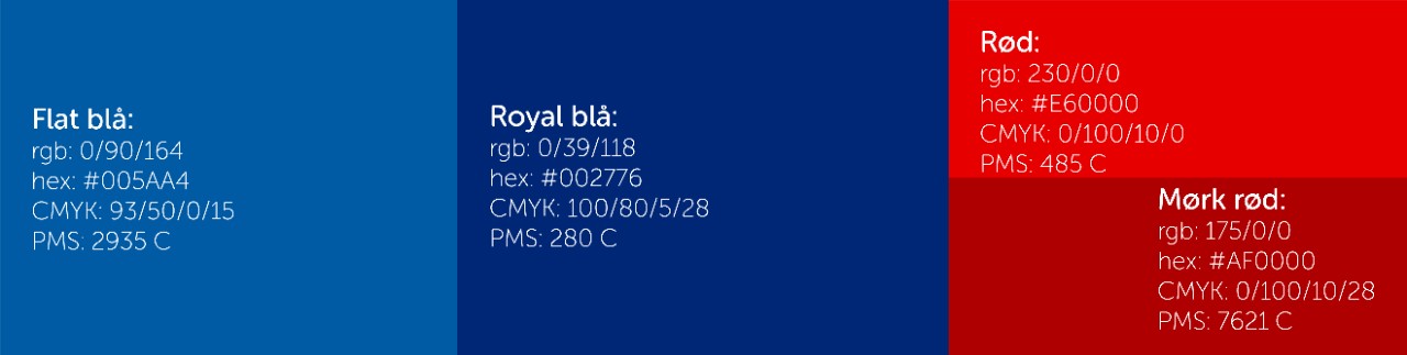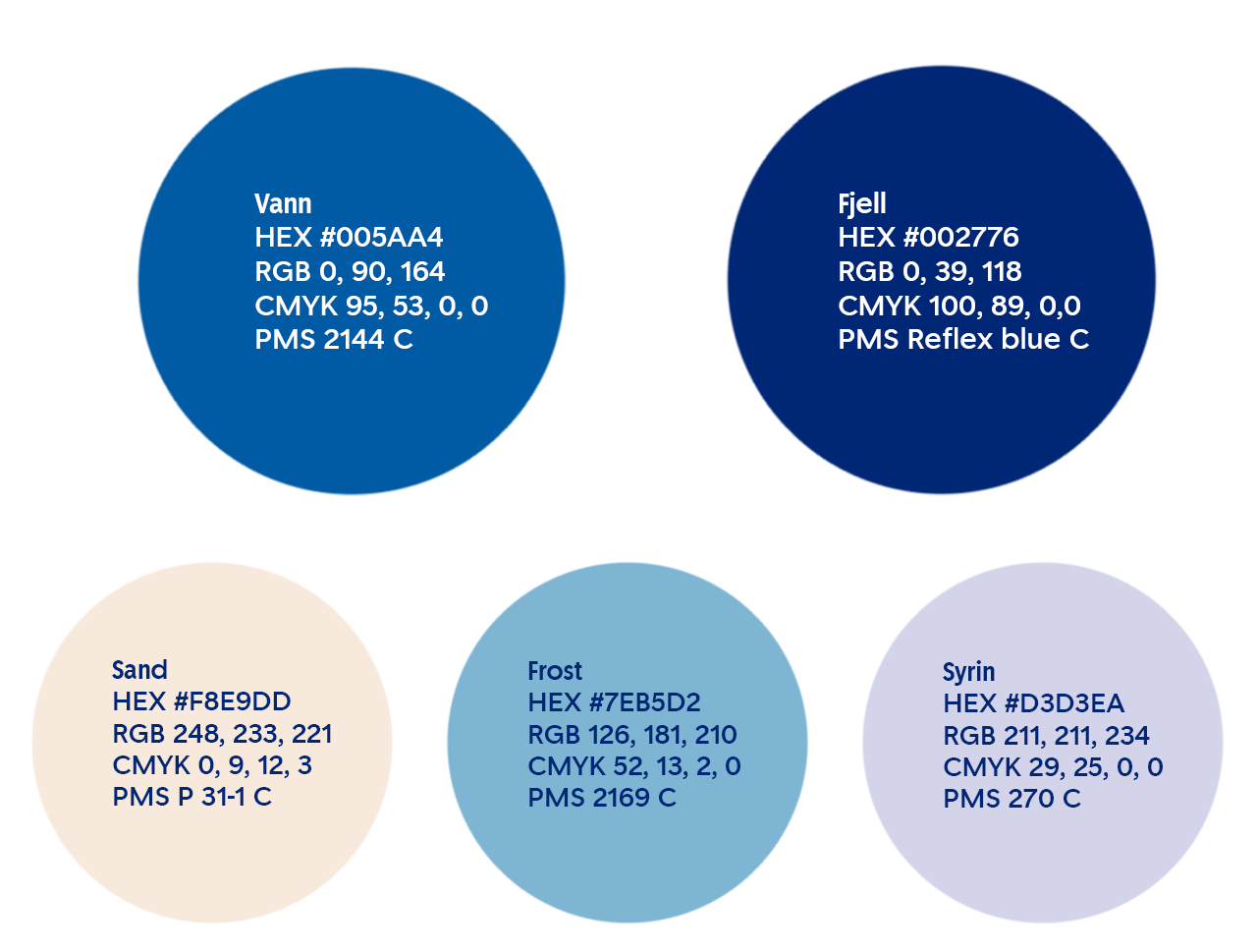 Blått er vår hovedfarge og støttefargene hjelper oss med å varmer opp det blå uttrykket i primærpaletten. Fargene i paletten er naturlige og basert på farger vi finner i norske landskap.
