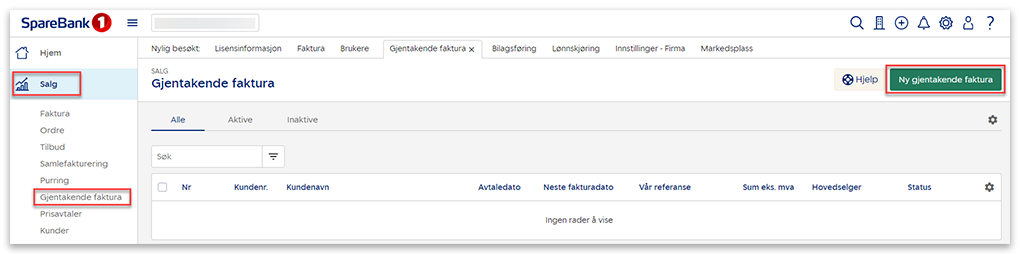 1. Gå til Salg i venstremenyen og velg Gjentakende faktura.
