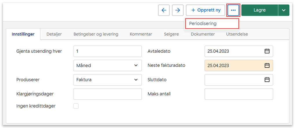 - Sluttdato: Siste dato for den gjentakende fakturaen. La feltet stå tomt hvis den skal genereres kontinuerlig.