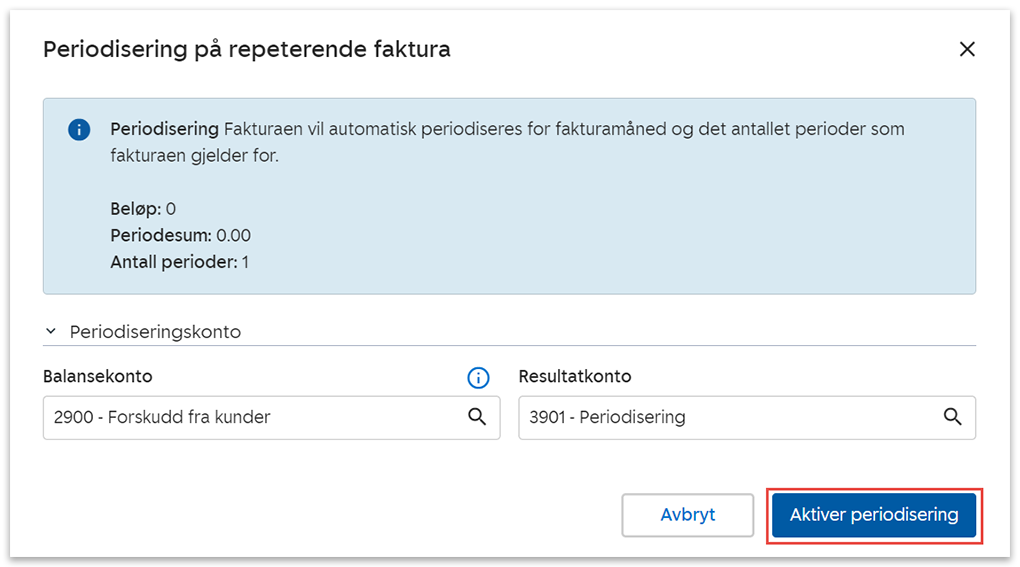 2. Klikk på Aktiver periodisering. Merk at fakturaen automatisk vil periodiseres for fakturamåned, og at du kun kan periodisere fremover.