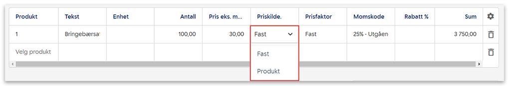 - Velg Fast hvis du ønsker at produktprisen skal være den samme hver gang det genereres ny faktura, uavhengig av produktets egentlige pris og eventuelle prisendringer på produktet.