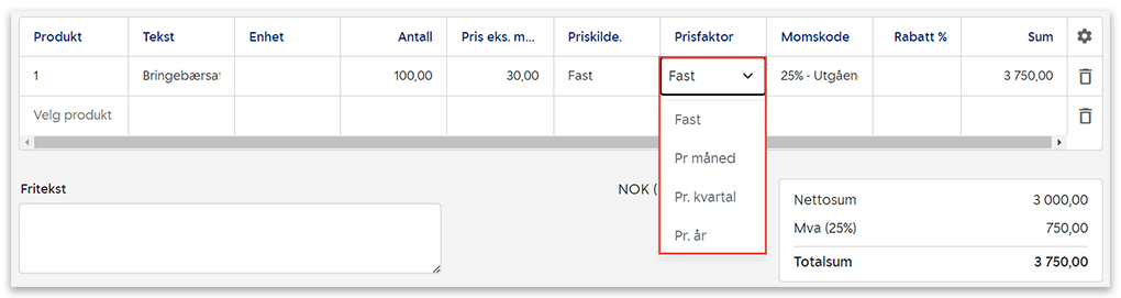 Dersom du har en gjentakende faktura med månedlig utsending, prisfaktor per kvartal og pris på produkt 15.000 kroner, vil produktprisen per faktura tilsvare 15.000 kroner/3 måneder = 5000 kroner per faktura.