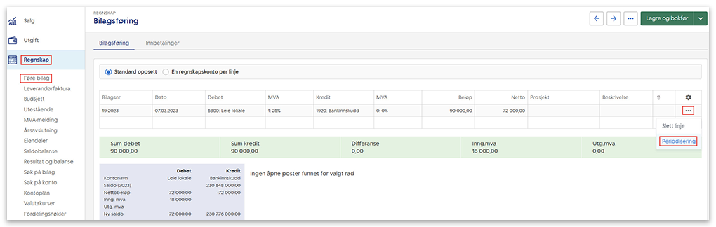 5. Trykk Lagre og bokfør for det manuelle bilaget slik at periodiseringen bokføres.