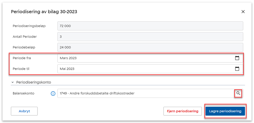 3. Legg inn Periode fra, Periode til og Balansekonto som du ønsker å bruke til å periodisere bilaget. Dersom du skal periodisere fremover i tid kan du bruke en konto i gruppe 17, og skal du periodisere tilbake i tid kan du bruke en konto i gruppe 29.