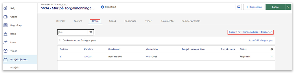 1. Gå til Prosjekt [BETA] i venstremenyen og klikk på Prosjekt. Velg aktuelt prosjekt og gå til Ordre for å få en oversikt over ordrer tilknyttet prosjektet.