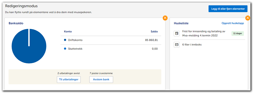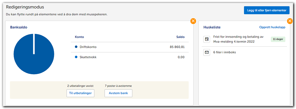 2. Nå får du opp Redigeringsmodus og kan flytte på de ulike widgetene ved å dra dem med musepekeren. Trykk på det oransje krysset hvis du vil fjerne en widget.