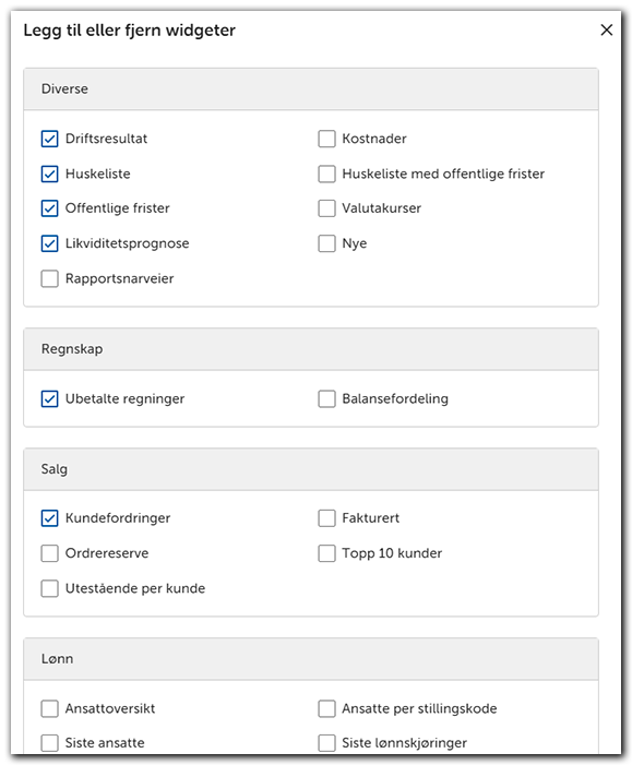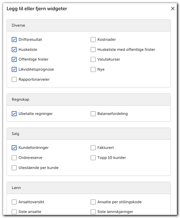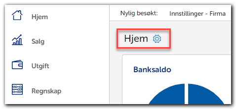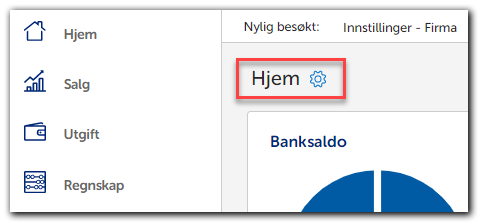 Hjem-sidener den du kommer til først når du åpner regnskapsprogrammet. Du kan også navigere deg til Hjem-siden fra menyen, den ligger helt øverst. Dashboardet på Hjem-siden kommer med et standard oppsett som inneholder informasjon og snarveier i såkalte widgeter. Dette oppsettet kan du endre.