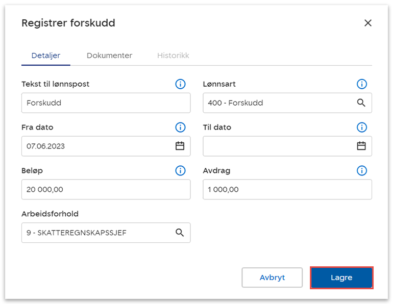 • Lønnsart: Hent inn lønnsarten forskuddet skal bruke. Lønnsart 400 er vår standard lønnsart for forskudd.