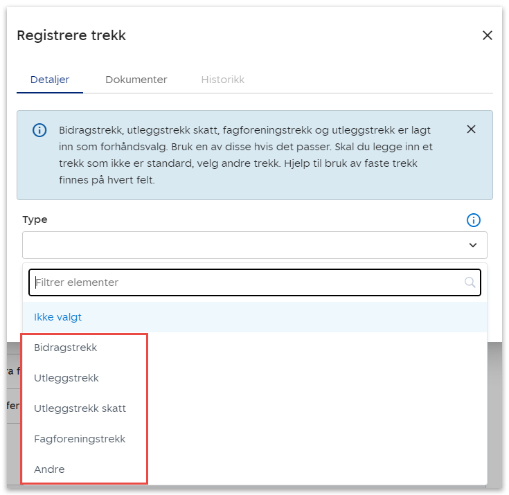 • Trekkmal: Hvis du allerede har opprettet en trekkmal kan du velge den her. Vi anbefaler å bruke trekkmal hvis du skal legge inn samme trekk på flere ansatte.