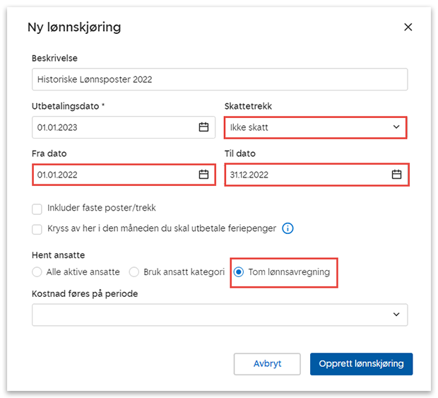 • Fra dato og Til dato: All historikk kan avregnes i en kjøring (som dette eksempelet viser). Du kan eventuelt legge inn måned for måned.