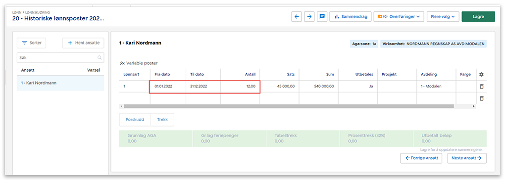 6. Legg inn alle verdier per ansatte under korrekt lønnsart, sats og antall.