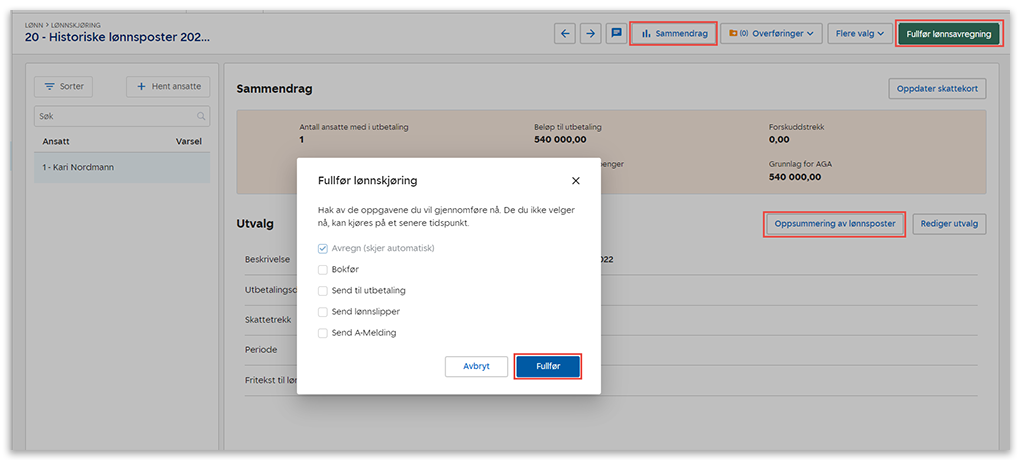 8. Klikk på Oppsummering av lønnsposter dersom du ønsker å se en oppsummering før du kjører lønnen.