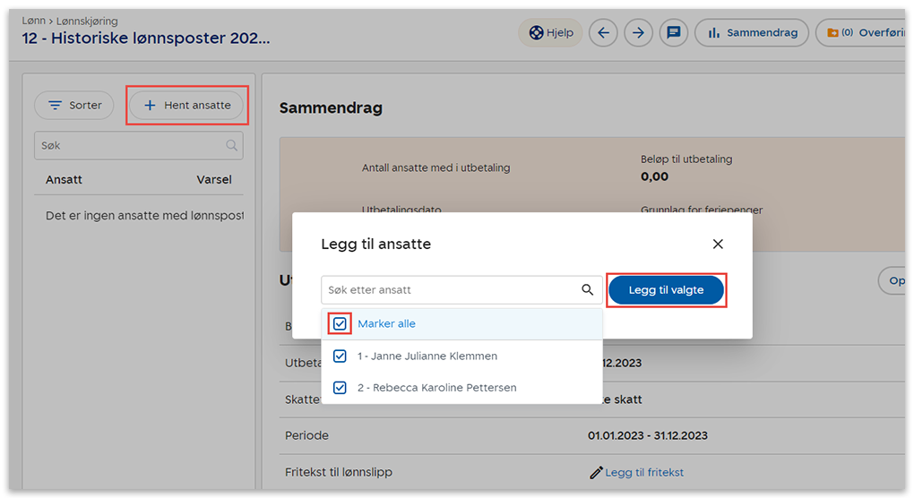4. Velg Hent ansatte og sett hake ved de ansatte du vil registrere lønnshistorikk på.