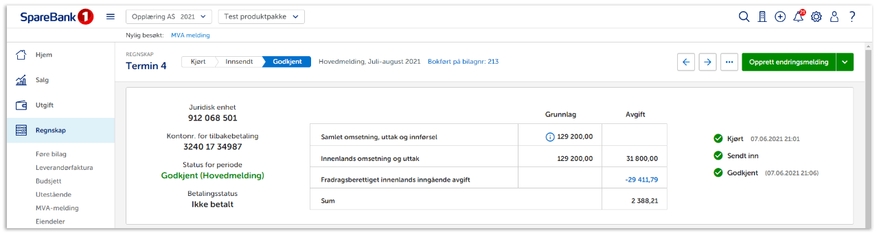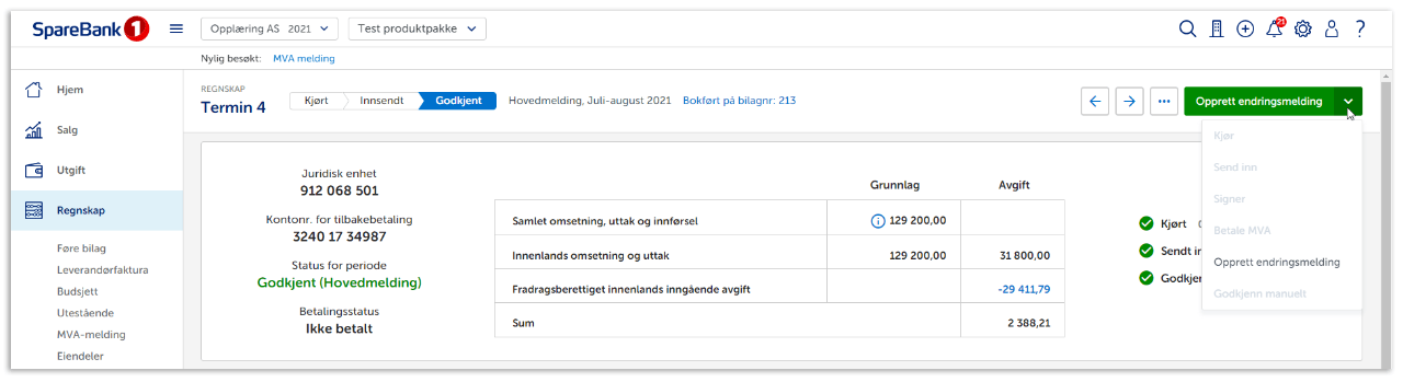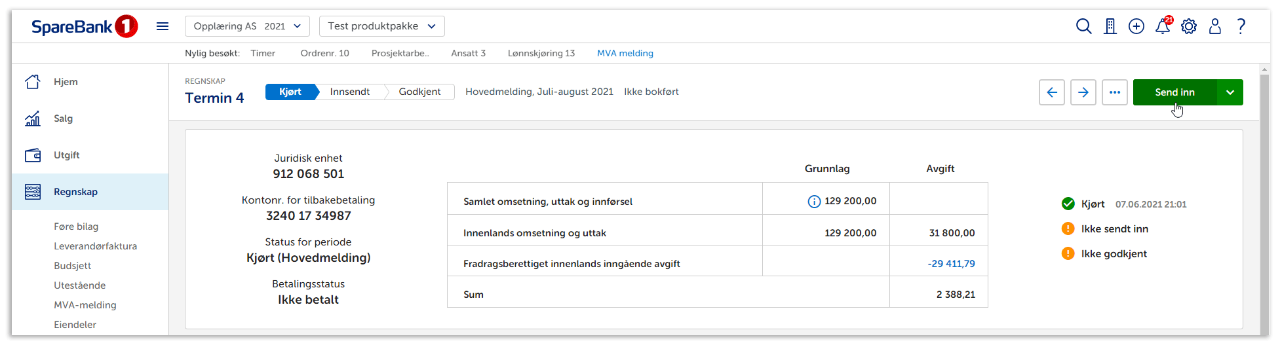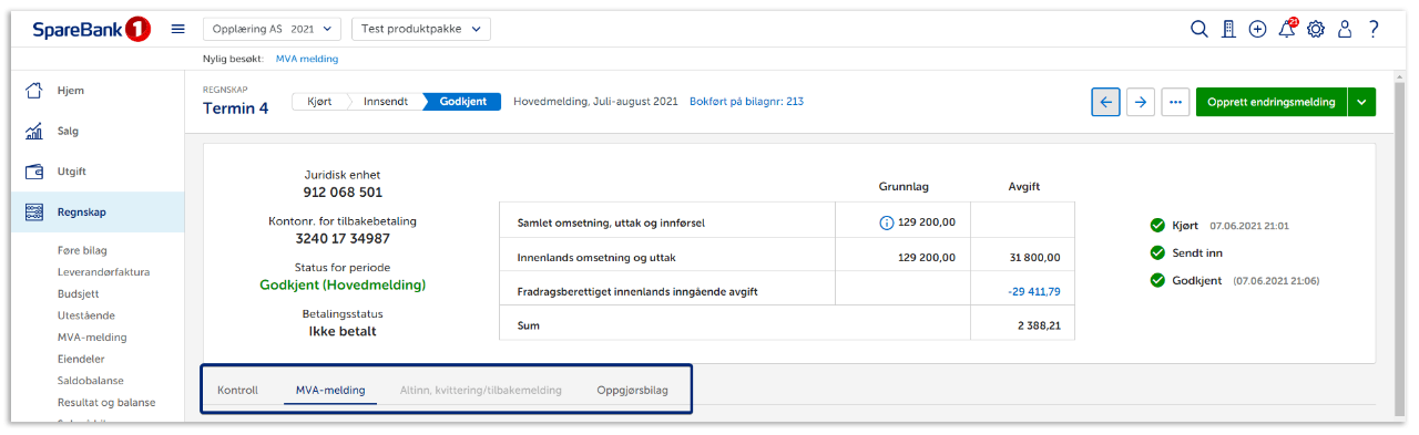 Mva-meldingen blir sendt inn. For at du skal kunne sende inn mva-meldingen og signere i SpareBank 1 Regnskap må du ha laget passord i Altinn.