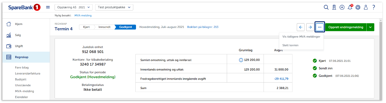 TIPS! Det kan være lurt å låse mva frem til siste datoen i terminen, for å unngå at det føres noe etter at du har kjørt terminen. Gjør du endringer i terminen må den kjøres på nytt før den sendes inn i neste steg.